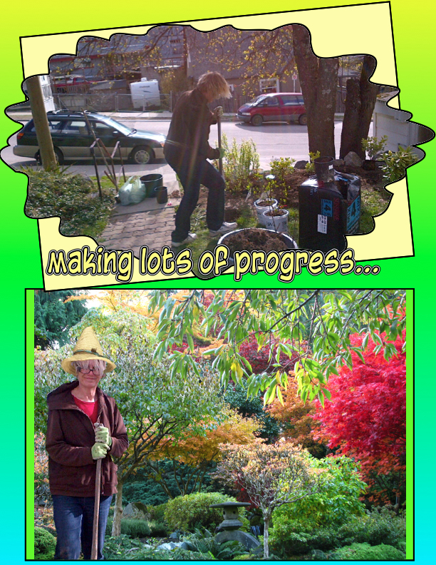 Oui, c’est moi – “gardening” (& photo-shopping – yes, that’s Butchart Gardens in the second pic) O.k., so I’m actually more of a digger, weed-whacker, lawn-mower and raker. It’s definitely Lee who’s better at the “fancy” stuff: deciding what goes in, putting it in, watering – ya know – the art of creating and sustaining life!