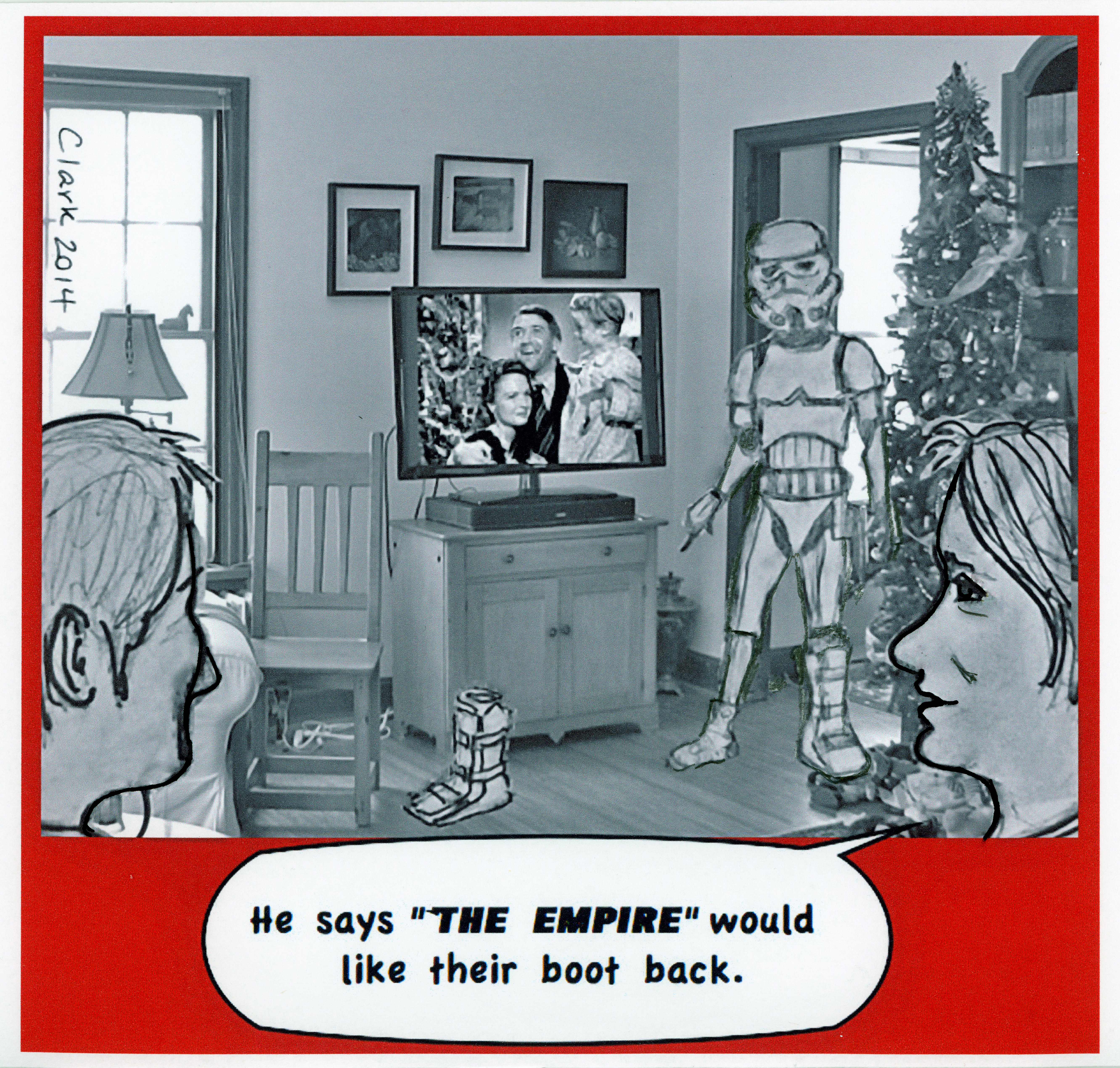 After more than 2 months of healing from a broken  bone in her foot (from a fall that happened at Thanksgiving), many trips to the bone specialist in Trail and MANY sighs of relief that bone surgery wouldn’t be needed in the long-term, on Dec. 22nd Lee was given the o.k. to walk again – & without her air cast!  I constantly mused that the cast made me think a stormtrooper had misplaced his boot.. so of course, had to make it the subject of my year-end cartoon.  It’s been a good year for us in Nelson — a lot of hard work mixed with a lot of good times.  We have great friends here and a very happy life in this lovely little mountain town.